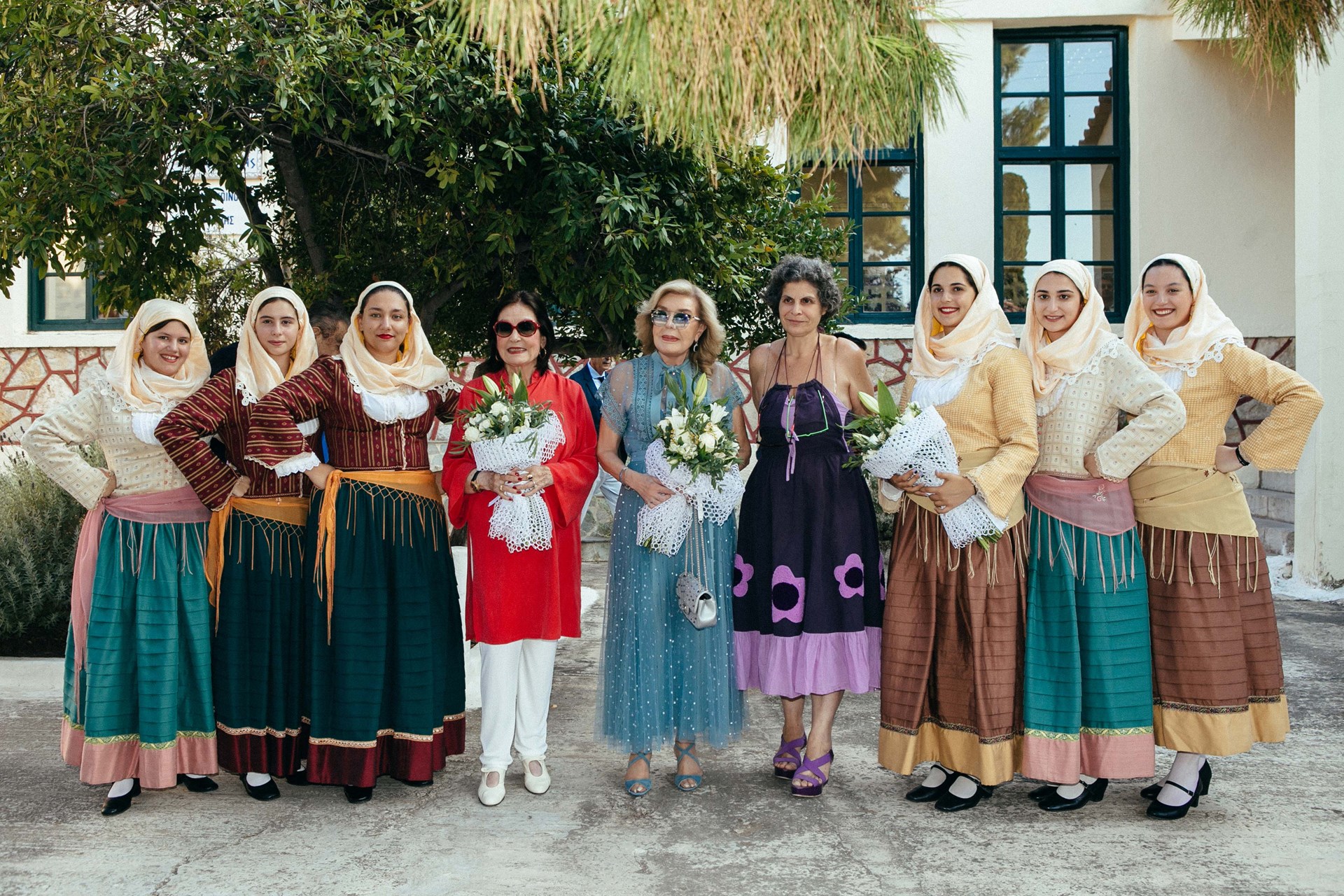 Ο Δήμαρχος Ερμιονίδας και Ερμιονίτισσες με παραδοσιακές στολές υποδέχονται την Μαριάννα και τον Βαρδή Ι. Βαρδινογιάννη, την Χριστιάννα Γουλανδρή και την Νάνα Μούσχουρη με τον σύζυγό της Andre Chapelle