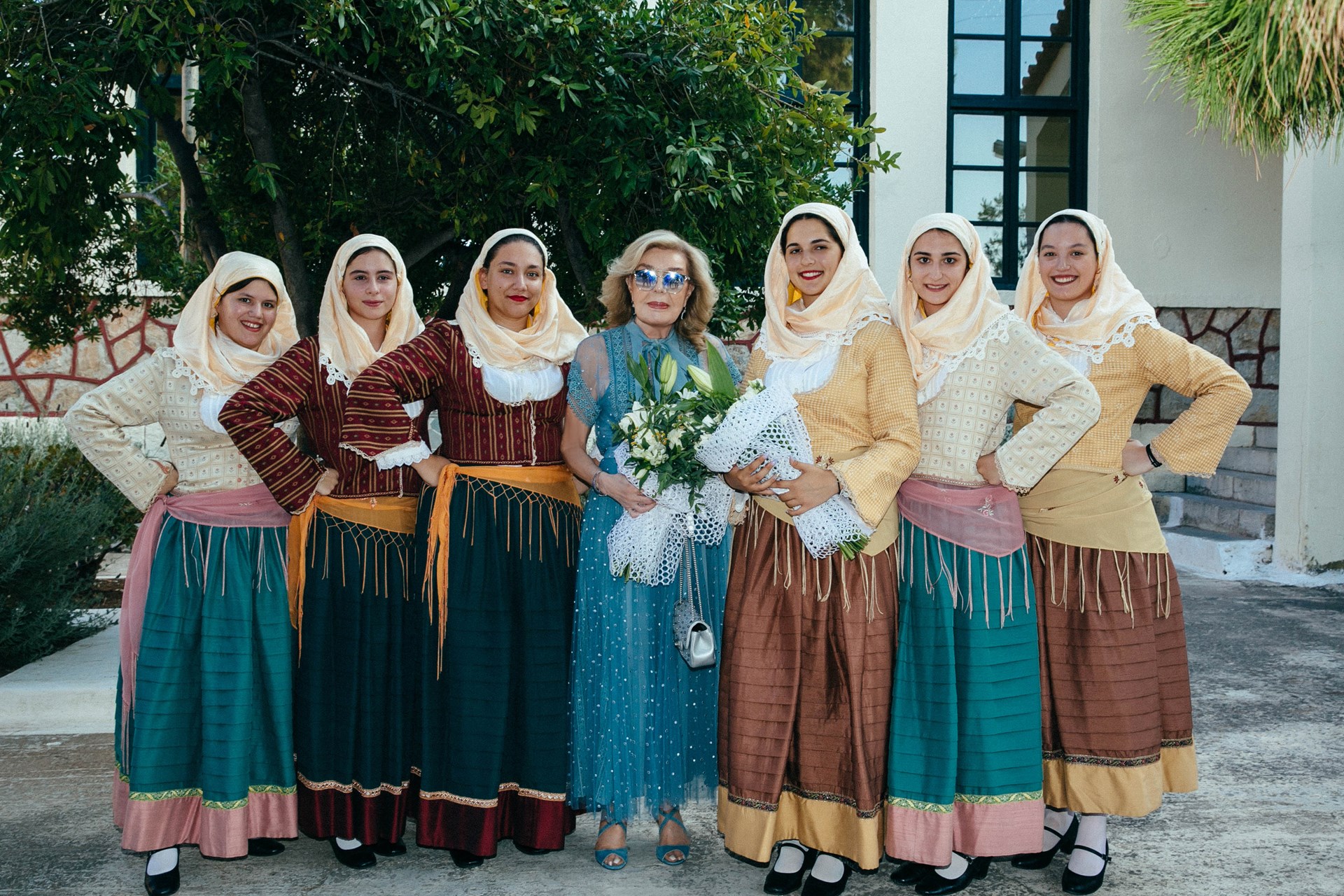 Ο Δήμαρχος Ερμιονίδας και Ερμιονίτισσες με παραδοσιακές στολές υποδέχονται την Μαριάννα και τον Βαρδή Ι. Βαρδινογιάννη, την Χριστιάννα Γουλανδρή και την Νάνα Μούσχουρη με τον σύζυγό της Andre Chapelle