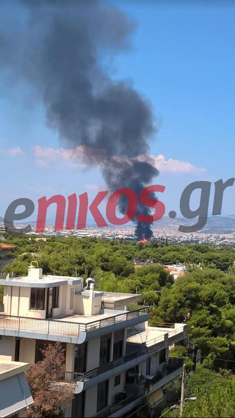 Πυκνοί, μαύροι καπνοί έχουν καλύψει τον ουρανό πάνω από την περιοχή. Η φωτιά καίει ξερά χόρτα και παλέτες.