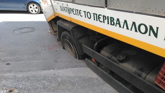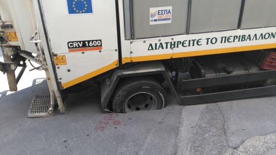 Μέσα σε μια… τρύπα στη μέση του δρόμου “βούλιαξε” η ρόδα ενός απορριμματοφόρου στον δήμο Κοζάνης.