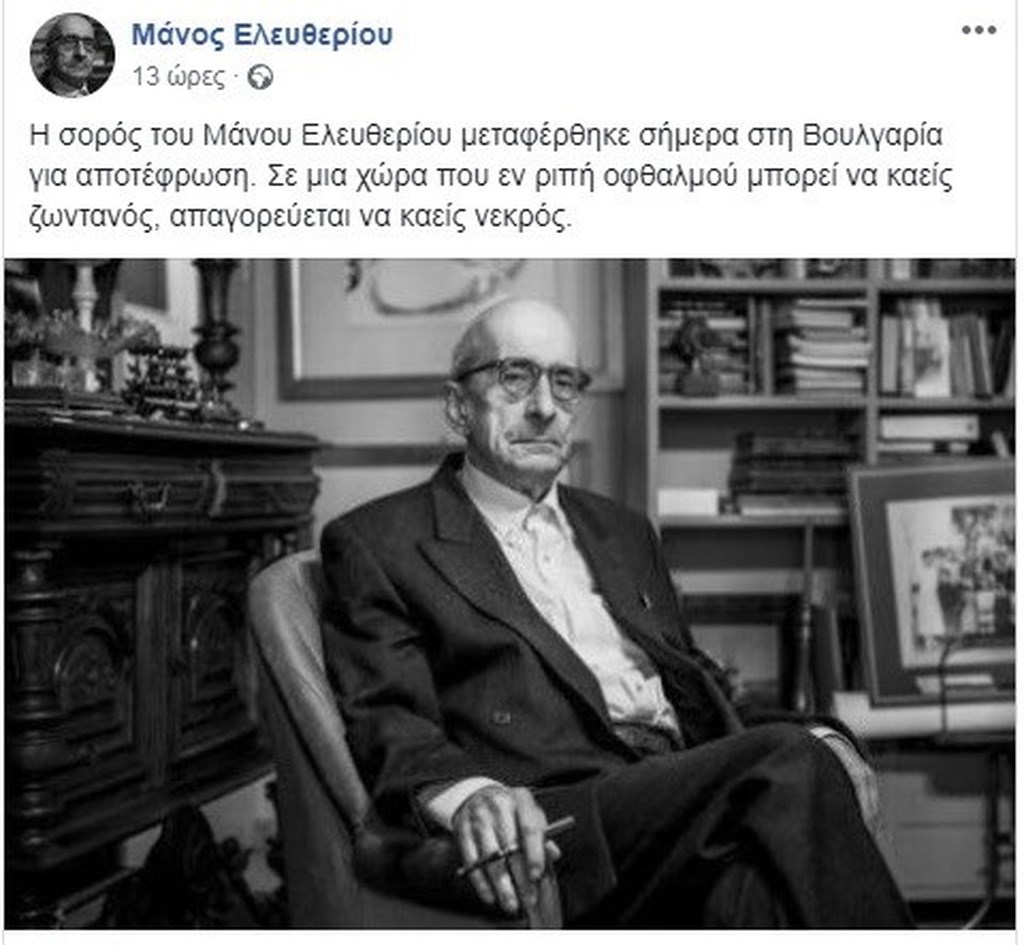 Η σορός του Μάνου Ελευθερίου μετά την πολιτική κηδεία του που πραγματοποιήθηκε την Τρίτη στο Α’ Νεκροταφείο Αθηνών, μεταφέρθηκε στη Βουλγαρία για να αποτεφρωθεί, όπως ο ίδιος επιθυμούσε.