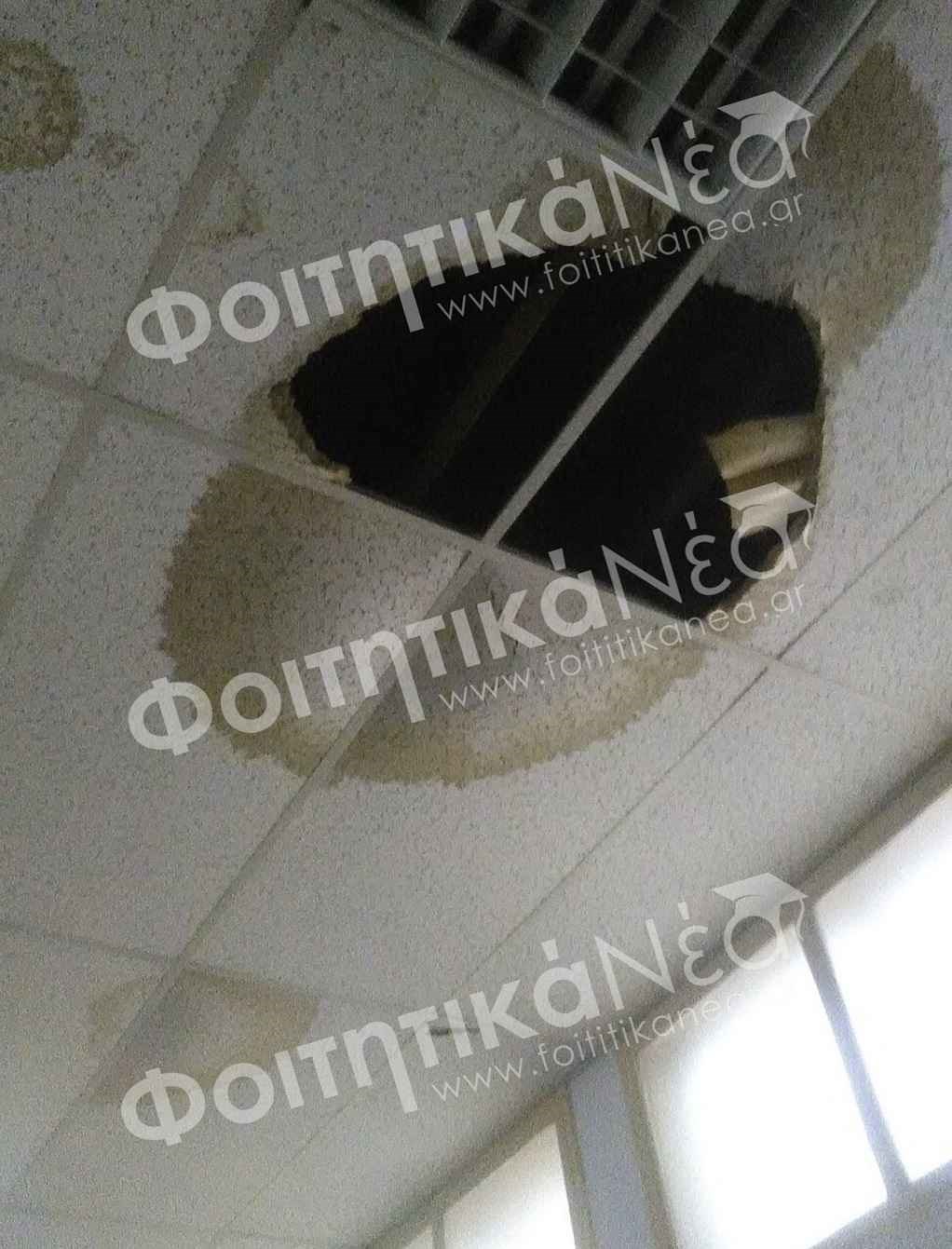 Σύμφωνα με το ΑΠΕ-ΜΠΕ, το πρόβλημα προέκυψε από διαρροή νερού στο καλοριφέρ της πτέρυγας των Μηχανολόγων Μηχανικών από κάποιο τρύπημα στις σωληνώσεις, που συνέβη μέσα στο Σαββατοκύριακο. Αποτέλεσμα ήταν να «ποτίσει» η ψευδοροφή σε διάδρομο έξω από αίθουσα διδασκαλίας και ένα κομμάτι της να σπάσει και να αποκολληθεί αφήνοντας μία τρύπα.