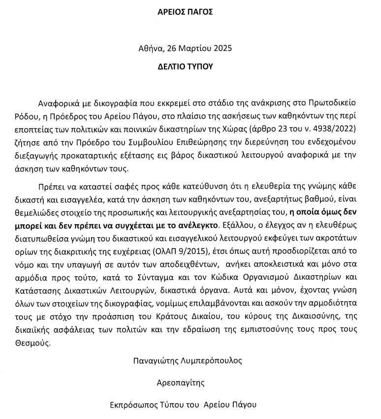 Αναφορικά με δικογραφία που εκκρεμεί στο στάδιο της ανάκρισης στο Πρωτοδικείο Ρόδου, η Πρόεδρος του Αρείου Πάγου, στο πλαίσιο της ασκήσεως των καθηκόντων της περί εποπτείας των πολιτικών και ποινικών δικαστηρίων της Χώρας (άρθρο 23 του ν. 4938/2022) ζήτησε από την Πρόεδρο του Συμβουλίου Επιθεώρησης την διερεύνηση του ενδεχομένου διεξαγωγής προκαταρτικής εξέτασης εις βάρος δικαστικού λειτουργού αναφορικά με την άσκηση των καθηκόντων τους.