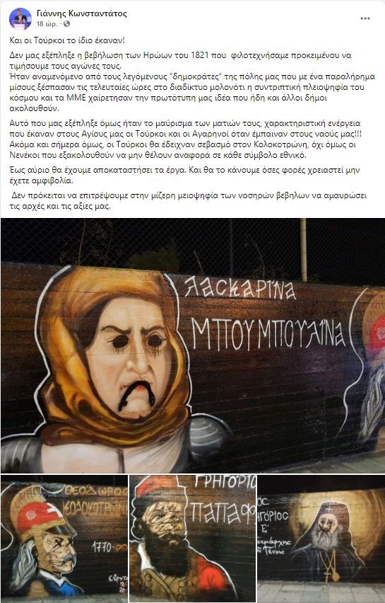 Την οργισμένη αντίδραση του δήμαρχου Ελληνικού-Αργυρούπολης, Γιάννη Κωνσταντάτου προκάλεσε ο βανδαλισμός των προσωπογραφιών των ηρώων του 1821. Ο Δήμος θέλοντας να τιμήσει τα 200 χρόνια από την Ελληνική Επανάσταση ανέθεσε στον καλλιτέχνη, “Εύρυτο” τη συγκεκριμένη εικαστική παρέμβαση. Άγνωστοι, ωστόσο, έβαλαν στο «στόχαστρό τους τα εν λόγω γκράφιτι που προκάλεσαν την αντίδραση του κ. Κωνσταντάτου, ο οποίος έκανε λόγο για «νενέκους» που δεν θέλουν καμία αναφορά σε εθνικό σύμβολο, διαβεβαιώνοντας παράλληλα ότι τα γκράφιτι θα αποκατασταθούν.