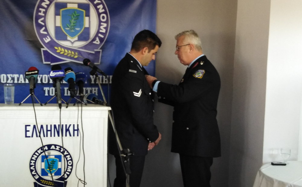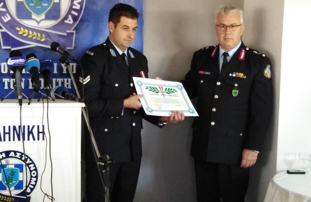 Όπως είπε ο διευθυντής της Διεύθυνσης Αστυνομίας Αχαΐας, ταξίαρχος Γεώργιος Μιχαλόπουλος, που απένειμε το μετάλλιο, «ο τιμώμενος αστυνομικός, εκτελώντας υπηρεσία στην ομάδα ΔΙΑΣ Αττικής, με απαράμιλλο ζήλο και ανδρεία, θέτοντας τον εαυτόν του σε κίνδυνο ζωής, συμμετείχε με συναδέλφους του στη σύλληψη ένοπλου δράστη.