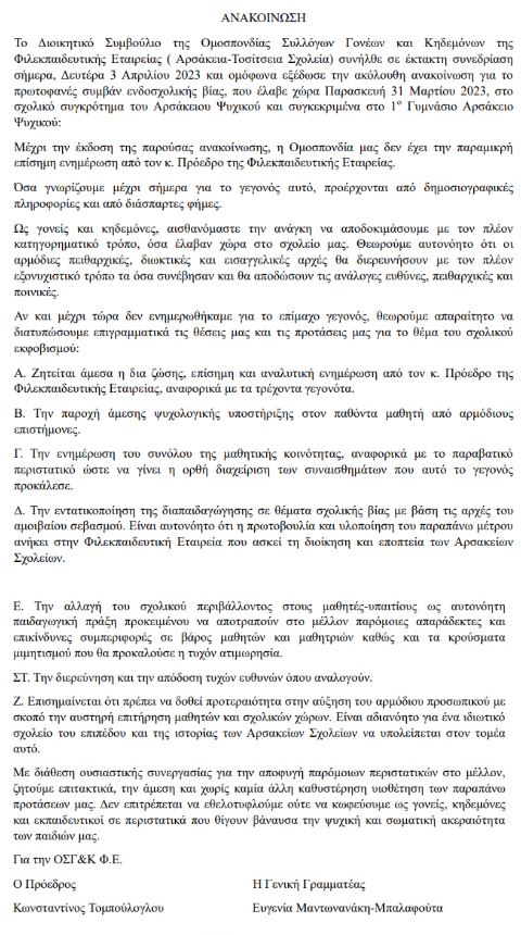 Ανακοίνωση με αφορμή το άγριο επεισόδιο bullying σε βάρος του 15χρονου μαθητή στο Αρσάκειο, εξέδωσε το Διοικητικό Συμβούλιο της Ομοσπονδίας Συλλόγων Γονέων και Κηδεμόνων της Φιλεκπαιδευτικής Εταιρείας (Αρσάκεια – Τοσίτσεια σχολεία).