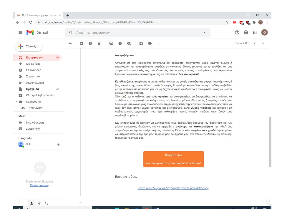 ΥΓ.: Σας ενημερώνουμε ότι κατά τη διάρκεια της θητείας μας από το 2013 δεν έχουμε λάβει καμία γραπτή ή προφορική καταγγελία αναφορικά με περιστατικά σεξουαλικής παρενόχλησης μαθητών. Σε αντίθετη περίπτωση θα τα είχαμε καταγγείλει στα αρμόδια όργανα της Δικαιοσύνης”.