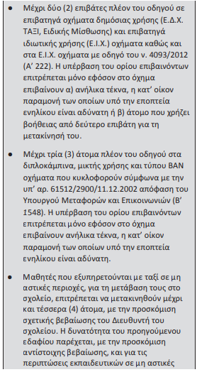Η υπέρβαση του ορίου επιβαινόντων επιτρέπεται μόνο εφόσον στο όχημα επιβαίνουν α) ανήλικα τέκνα, η κατ’ οίκον παραμονή των οποίων υπό την εποπτεία ενηλίκου είναι αδύνατη ή β) άτομο που χρήζει βοήθειας από δεύτερο επιβάτη για τη μετακίνησή του. Σημειώνεται ότι οι επιβάτες θα πρέπει να συνεχίσουν να φορούν μάσκα.