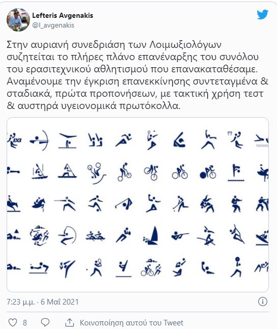 “Στην αυριανή συνεδρίαση των λοιμωξιολόγων, συζητείται το πλήρες πλάνο επανέναρξης του συνόλου του ερασιτεχνικού αθλητισμού που επανακαταθέσαμε. Αναμένουμε την έγκριση επανεκκίνησης συντεταγμένα και σταδιακά, πρώτα προπονήσεων, με τακτική χρήση τεστ και αυστηρά υγειονομικά πρωτόκολλα”, έγραψε ο κ. Αυγενάκης.