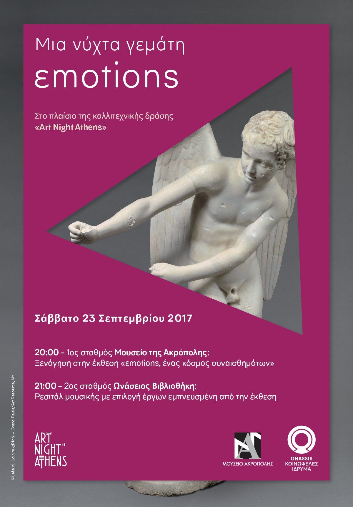 Το Μουσείο της Ακρόπολης και το Ίδρυμα Ωνάση συμμετέχουν στη μεγάλη καλλιτεχνική δράση των atenistas Art Night Athens και δημιουργούν «Μια νύχτα γεμάτη εmotions». Το Σάββατο 23 Σεπτεμβρίου, σε μια νύχτα-γιορτή για την τέχνη και τον πολιτισμό, η έκθεση εmotions, η οποία παρουσιάζεται στο Μουσείο της Ακρόπολης με πρωτοβουλία του Ιδρύματος Ωνάση, θα μυήσει μία ομάδα επισκεπτών στα συναισθήματα του αρχαίου κόσμου, μέσα από δύο διαδοχικές δράσεις: μια απολαυστική ξενάγηση στην έκθεση (στις 20:00) από το εξειδικευμένο προσωπικό του Μουσείου της Ακρόπολης και ένα ρεσιτάλ μουσικής με επιλογή έργων, εμπνευσμένη από την έκθεση εmotions, που θα πραγματοποιηθεί στην Ωνάσειο Βιβλιοθήκη (Αμαλίας 56, 21:00).