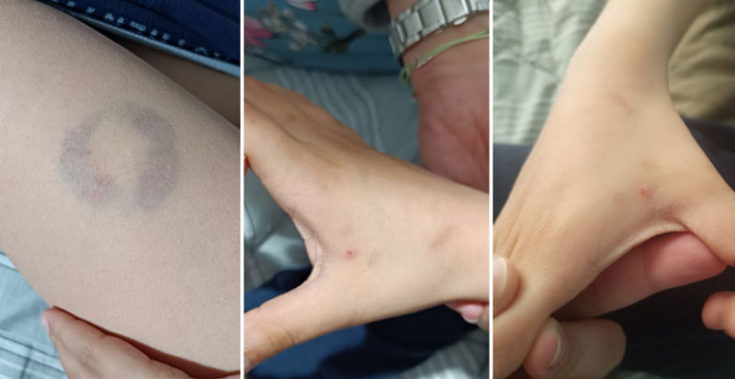 “Ρώτησα τη δασκάλα του γιου μου τί συνέβη, καθώς το παιδί μου όταν έφυγε το πρωί από το σπίτι μας δεν έφερε κάποιο τραύμα. Η ίδια μου απάντησε ότι τα συγκεκριμένα τραύματα προκλήθηκαν από την προσπάθεια που έκανε η Διευθύντρια και δασκάλα του σχολείου να απομακρύνει από κοντά της το παιδί μου, το οποίο της είχε πιάσει τα μαλλιά της. Η έκπληξή μου συνεχίστηκε όταν έφτασα σπίτι μας και άλλαξα ρούχα στο γιο μου, και πήγα να τον κάνω μπάνιο, όπου εκεί, κατεβάζοντας τη φόρμα του, είδα μια τεράστια μελανιά – δαγκωματιά στο μέσο του ποδιού του, μάλιστα πρόκειται για μια μελανιά (όπως βλέπετε και στις φωτογραφίες) όπου φαίνονται ίχνη δοντιών. Αυτό με έκανε αμέσως να καταλάβω ότι κάποιος δάγκωσε τον γιο μου δυνατά στο σημείο αυτό” εξηγεί η ίδια.