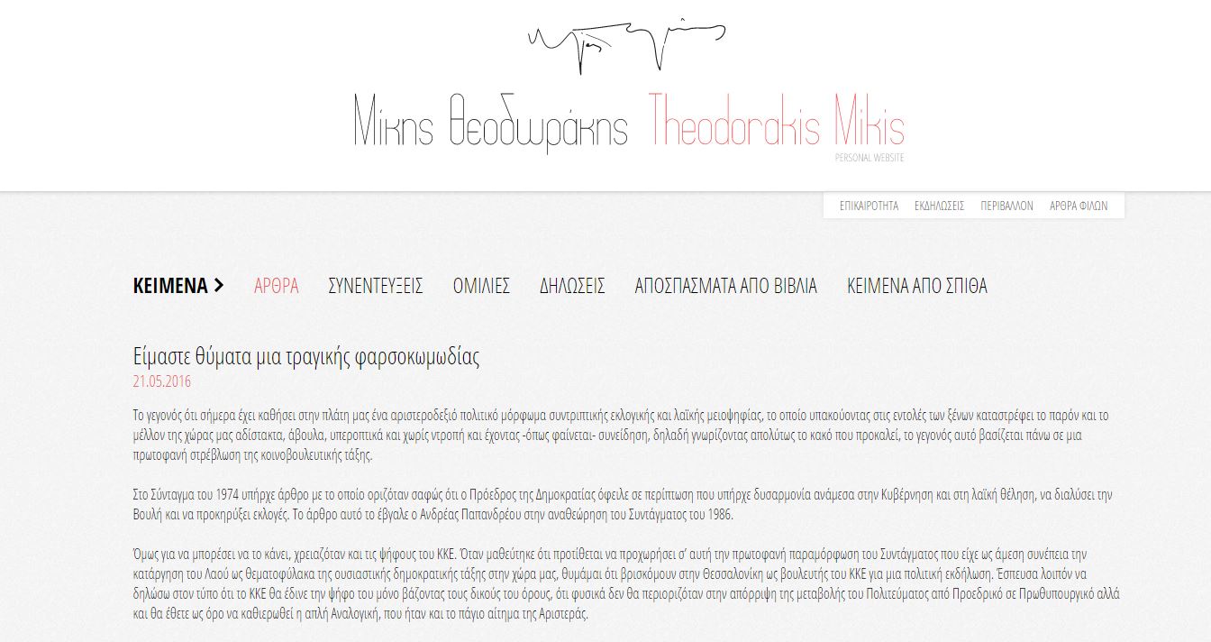Άρθρο-παρέμβαση 1.128 λέξεων από τον Μίκη Θεοδωράκη στην προσωπική του ιστοσελίδα, “mikistheodorakis.gr”.