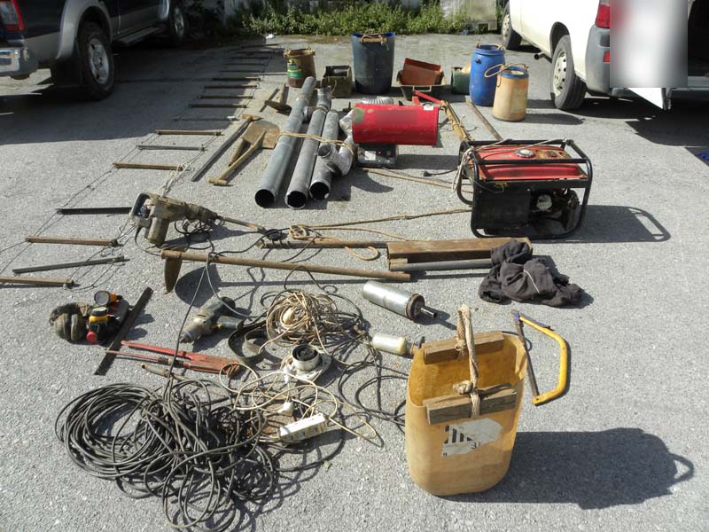 Στο χώρο της παράνομης ανασκαφής βρέθηκαν και κατασχέθηκαν διάφορα εργαλεία (γεννήτρια, αναβατόριο, σκαπτικά εργαλεία, αυτοσχέδιες μεταλλικές κατασκευές για τη στήριξη της σήραγγας κ.α.) και υπολείμματα αμμωνιοδυναμίτιδας.