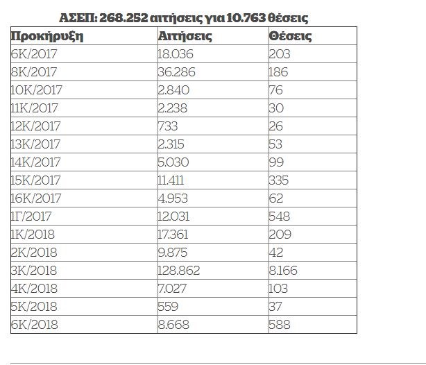 Δείτε τον πίνακα με την κατανομή των αιτήσεων και των θέσεων ανά προκήρυξη: