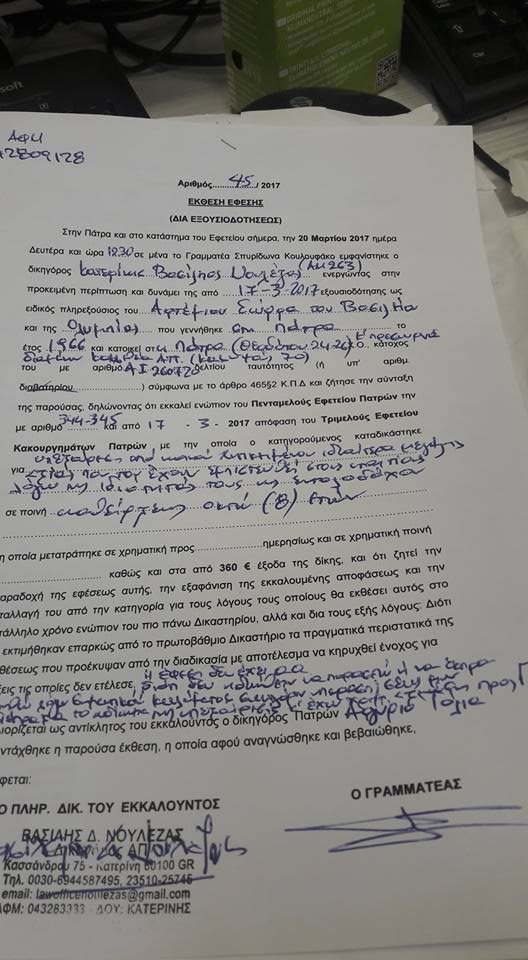 Έφεση κατά της καταδικαστικής απόφασης άσκησε ο Αρτέμης Σώρρας μέσω του πληρεξούσιου δικηγόρου Βασίλη Νουλέζα. Ο πρόεδρος της «Ελλήνων Συνέλευσις» και η σύζυγος του, Βάια Ρουγκλίου Σώρρα, καταδικάστηκαν σε οκταετή κάθειρξη χωρίς αναστολή στην έφεση και πενταετή στέρηση των πολιτικών του δικαιωμάτων.Σε ανακοίνωση που εξέδωσε ο δικηγόρος Βασίλης Νουλέζας σημειώνει χαρακτηριστικά: «Θα ασκηθεί άμεσα έφεση καθώς επίσης αίτηση αναστολής εκτέλεσης ποινής (άρθρο 497 παράγραφος 7ΚΠΔ) με αίτημα να ανασταλεί ποινής (άρθρο 497 παράγραφος 7 ΚΠΔ) με αίτημα να ανασταλεί υπό όρους η επιβληθείσα ποινή μέχρι ότου επανακριθεί η υπόθεση σε δεύτερο βαθμό. Προσδοκούμε δικαιότερη και πιο αντικειμενική αποκαλυπτική κρίση σε δεύτερο βαθμό».