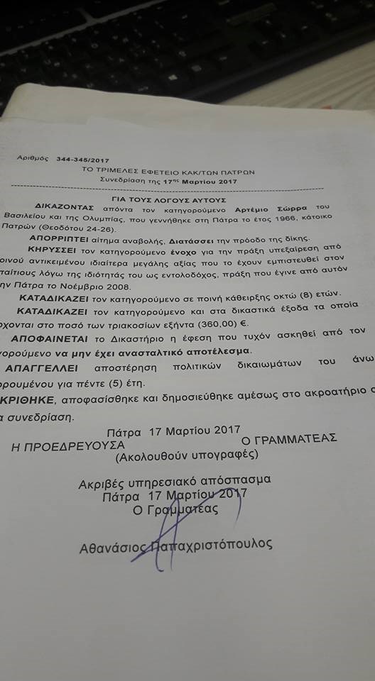 Έφεση κατά της καταδικαστικής απόφασης άσκησε ο Αρτέμης Σώρρας μέσω του πληρεξούσιου δικηγόρου Βασίλη Νουλέζα. Ο πρόεδρος της «Ελλήνων Συνέλευσις» και η σύζυγος του, Βάια Ρουγκλίου Σώρρα, καταδικάστηκαν σε οκταετή κάθειρξη χωρίς αναστολή στην έφεση και πενταετή στέρηση των πολιτικών του δικαιωμάτων.Σε ανακοίνωση που εξέδωσε ο δικηγόρος Βασίλης Νουλέζας σημειώνει χαρακτηριστικά: «Θα ασκηθεί άμεσα έφεση καθώς επίσης αίτηση αναστολής εκτέλεσης ποινής (άρθρο 497 παράγραφος 7ΚΠΔ) με αίτημα να ανασταλεί ποινής (άρθρο 497 παράγραφος 7 ΚΠΔ) με αίτημα να ανασταλεί υπό όρους η επιβληθείσα ποινή μέχρι ότου επανακριθεί η υπόθεση σε δεύτερο βαθμό. Προσδοκούμε δικαιότερη και πιο αντικειμενική αποκαλυπτική κρίση σε δεύτερο βαθμό».