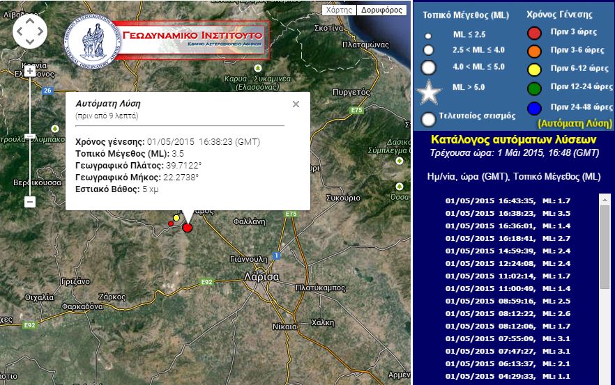 Ασθενής σεισμική δόνηση, εντάσεως 3,5 βαθμών της κλίμακας Ρίχτερ σημειώθηκε πριν από λίγα λεπτά στην ευρύτερη περιοχή της Λάρισας.