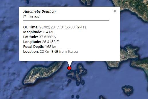 Ασθενής σεισμική δόνηση σημειώθηκε στις 3.55 τα ξημερώματα της Κυριακής στα ανοιχτά της Ικαρίας.Σύμφωνα με το Γεωδυναμικό Ινστιτούτο του Αστεροσκοπείου Αθηνών, η σεισμική δόνηση ήταν μεγέθους 3,4 βαθμών της κλίμακας Ρίχτερ σε εστιακό βάθος 168 χιλιομέτρων. Όσο για το επίκεντρο του σεισμού, εντοπιζόταν στα 22 χιλιόμετρα ανατολικά-βορειοανατολικά του νησιού.Δείτε τη φωτογραφία: