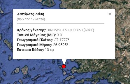 Συγκεκριμένα, βάσει της αυτόματης, προκαταρτικής λύσης του Γεωδυναμικού Ινστιτούτου του Αστεροσκοπείου Αθηνών, η δόνηση, που σημειώθηκε στις 4.03:58, ήταν 3 βαθμών της κλίμακας Ρίχτερ σε εστιακό υποθαλάσσιο βάθος 10 χιλιομέτρων.