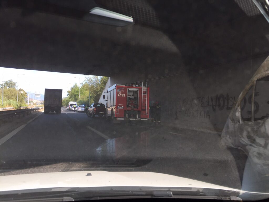 Φωτιά ξέσπασε σε ασθενοφόρο στο ύψος του κόμβου Βελεστίνου, με αποτέλεσμα το όχημα να καεί ολοσχερώς.