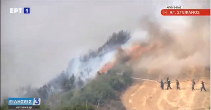 Ασύλληπτες εικόνες κατέγραψε η κάμερα της ΕΡΤ στον οικισμό Ποντίων στον Άγιο Στέφανο, όπου υπήρξε μία τεράστια εστία φωτιάς. Οι πυροσβέστες δημιουργήσαν μία ανθρώπινη αλυσίδα, παρατάχθηκαν σε διάταξη μάχης και προσπάθησαν με όλες τους τις δυνάμεις να ελέγξουν τη μανία της πυρκαγιάς.