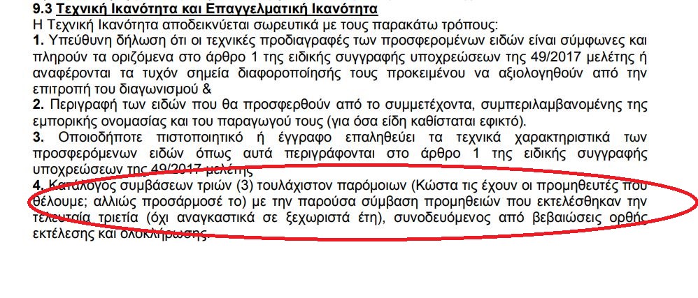 Αν διαβάσει κανείς προσεκτικά το κείμενο στη σελίδα 8 και συγκεκριμένα την παράγραφο 9.3, που αφορά στην τεχνική ικανότητα και την επαγγελματική ικανότητα του εργολάβου, θα δει τη φράση… «Κώστα τις έχουν οι προμηθευτές που θέλουμε; Αλλιώς προσάρμοσέ το»!