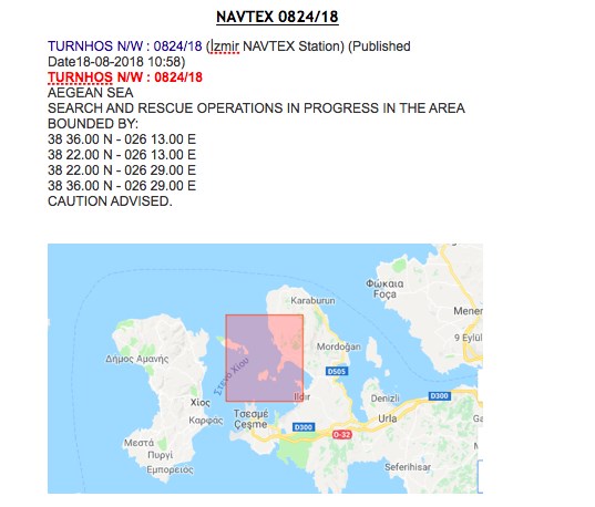 Με αφορμή την ανατροπή λέμβου στις Οινούσσες με έναν νεκρό κι έναν αγνοούμενο, οι Τούρκοι μας θύμισαν τις διεκδικήσεις τους εκδίδοντας ΝΟΤΑΜ και NAVTEX για επιχείρηση έρευνας και διάσωσης στην περιοχή.Να υπενθυμίσουμε ότι το νησί Παναγιά που βρίσκεται δίπλα στις Οινούσσες, είναι ένα από τα πολλά που οι Τούρκοι αμφισβητούν με υπερπτήσεις.Δείτε την τουρκική NAVTEX:
