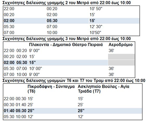 Η 24ωρη λειτουργία μέσων σταθερής τροχιάς αφορά τις γραμμές 2 και 3 του Μετρό και τις γραμμές Τ6 και Τ7 του Τραμ.