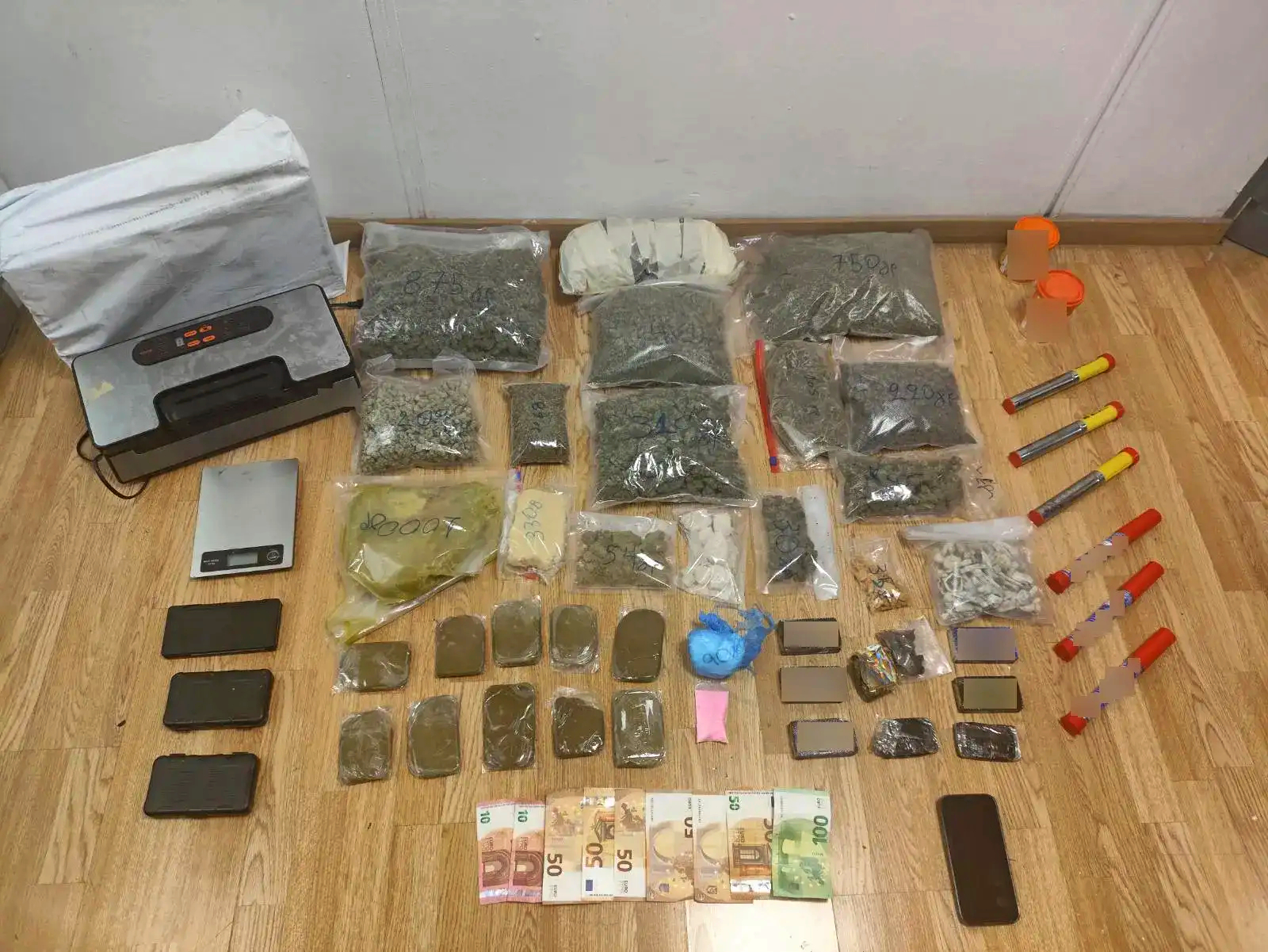 Οι αρχές κατέσχεσαν επίσης τέσσερις ζυγαριές ακριβείας, έναν πλαστικοποιητή, έξι φωτοβολίδες, δύο καπνογόνα, το χρηματικό ποσό των 420 ευρώ και ένα κινητό τηλέφωνο, στοιχεία που παραπέμπουν σε οργανωμένη δραστηριότητα διακίνησης.