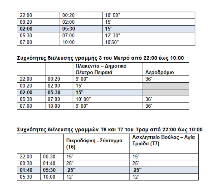 Η 24ωρη λειτουργία μέσων σταθερής τροχιάς αφορά τις γραμμές 2 και 3 του Μετρό και τις γραμμές Τ6 και Τ7 του Τραμ.