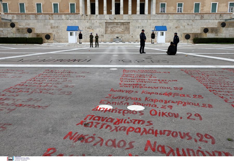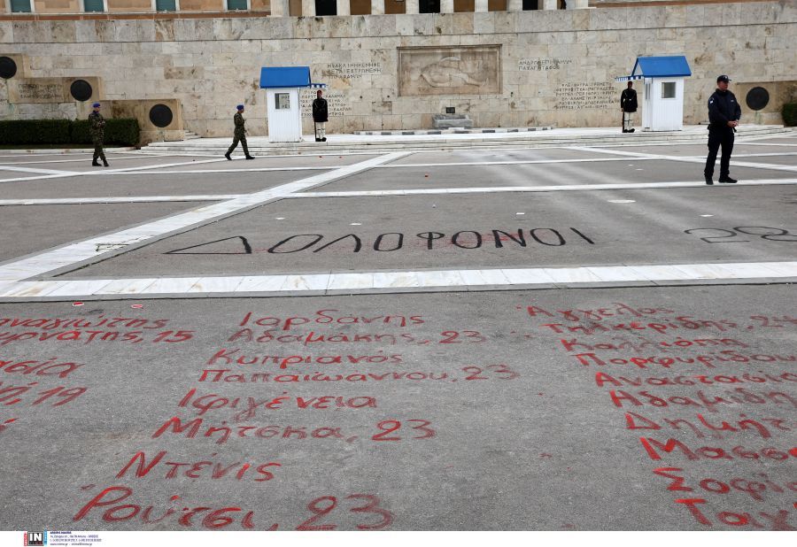 Φτάνοντας μπροστά από τη Βουλή διαδηλωτές και διαδηλώτριες έγραψαν με κόκκινη μπογιά μπροστά από το μνημείο του ‘Αγνωστου Στρατιώτη τα ονοματεπώνυμα και τις ηλικίες των 57 νεκρών από το σιδηροδρομικό δυστύχημα στα Τέμπη.