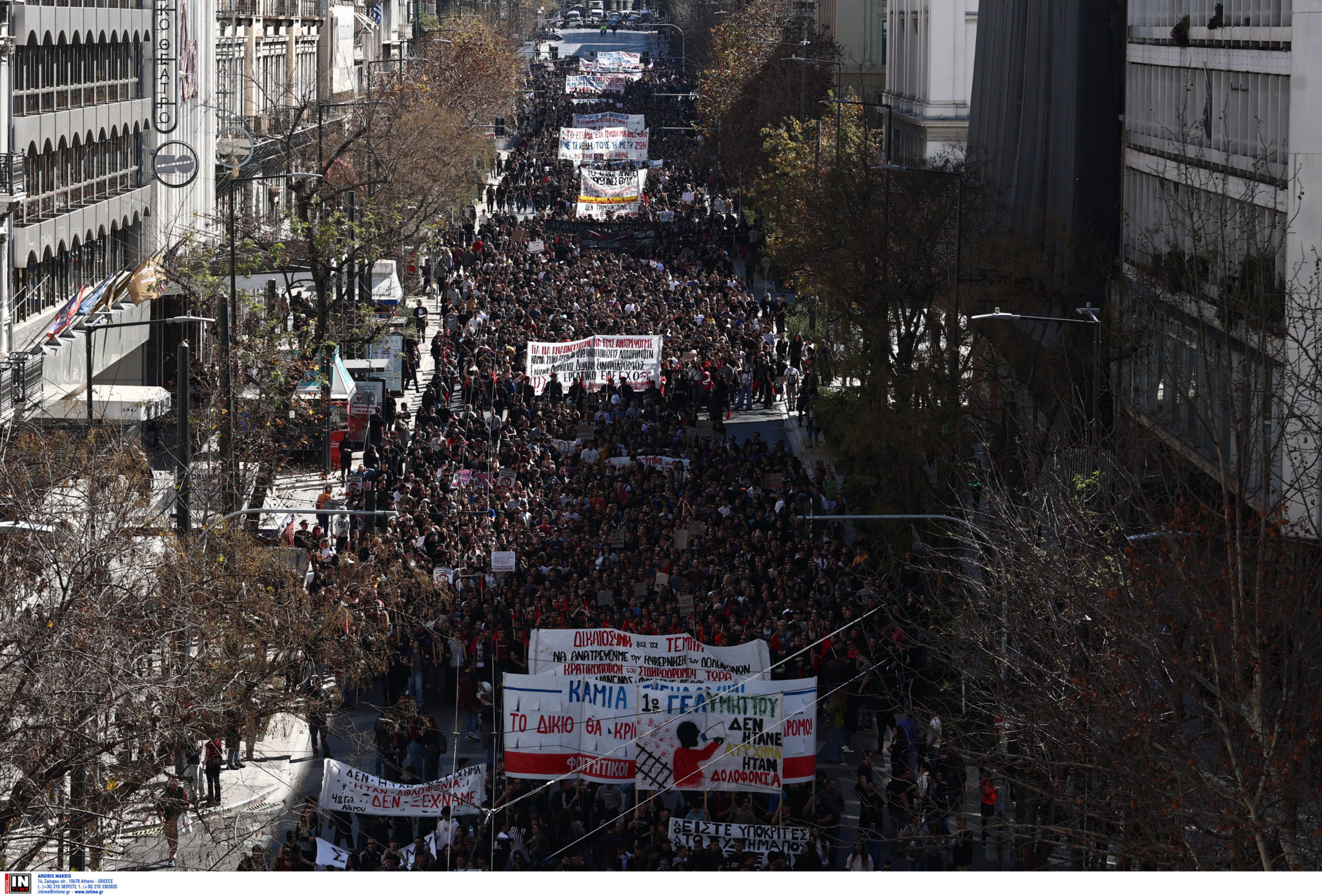 Όταν η πορεία έφτασε μπροστά από το Κοινοβούλιο, φοιτητές κρατώντας χαρτόνια σχημάτισαν σύνθημα «Ή τα κέρδη τους ή οι ζωές μας».