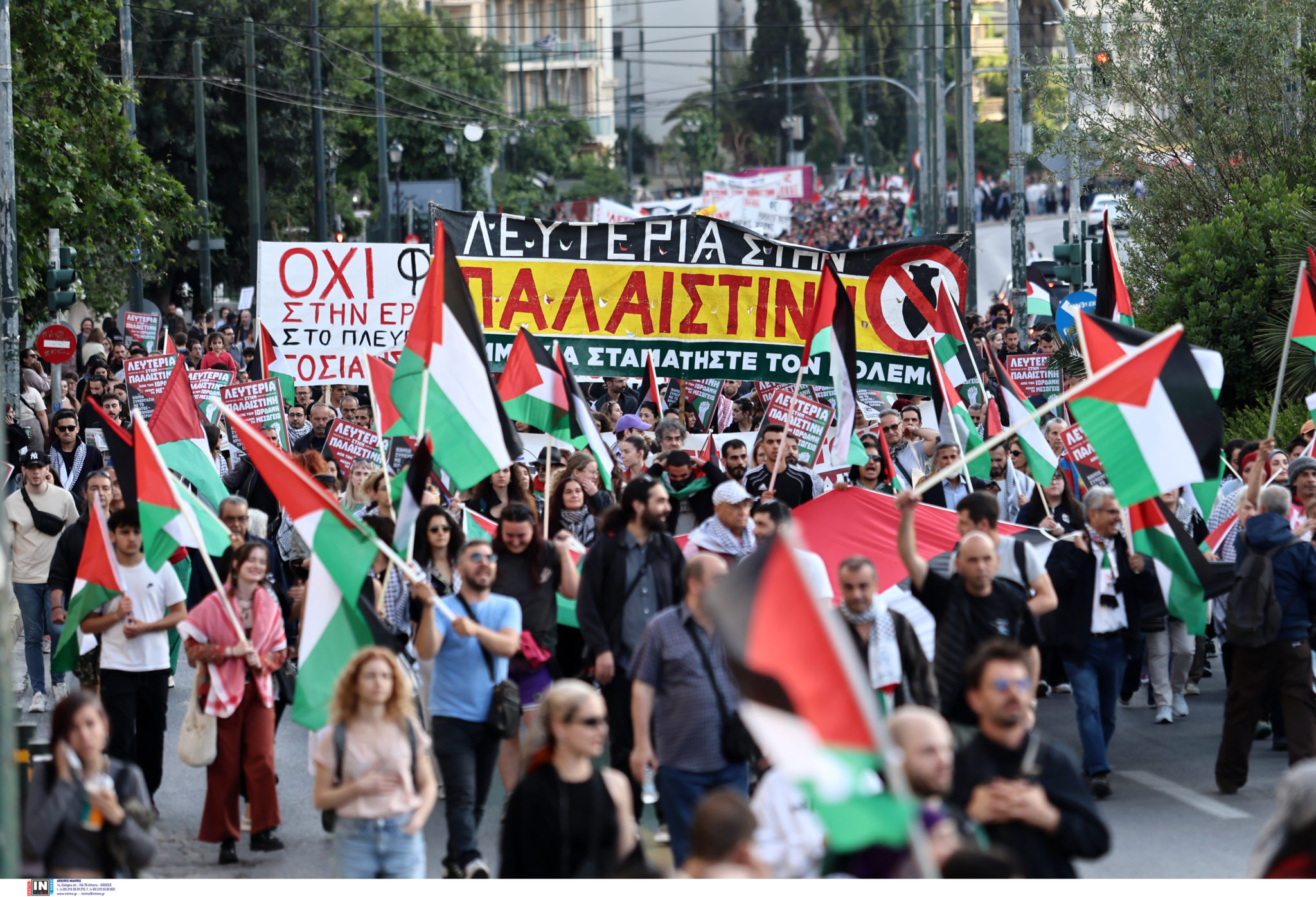 Πορεία διαμαρτυρίας για την Παλαιστίνη βρίσκεται σε εξέλιξη στην Αθήνα.