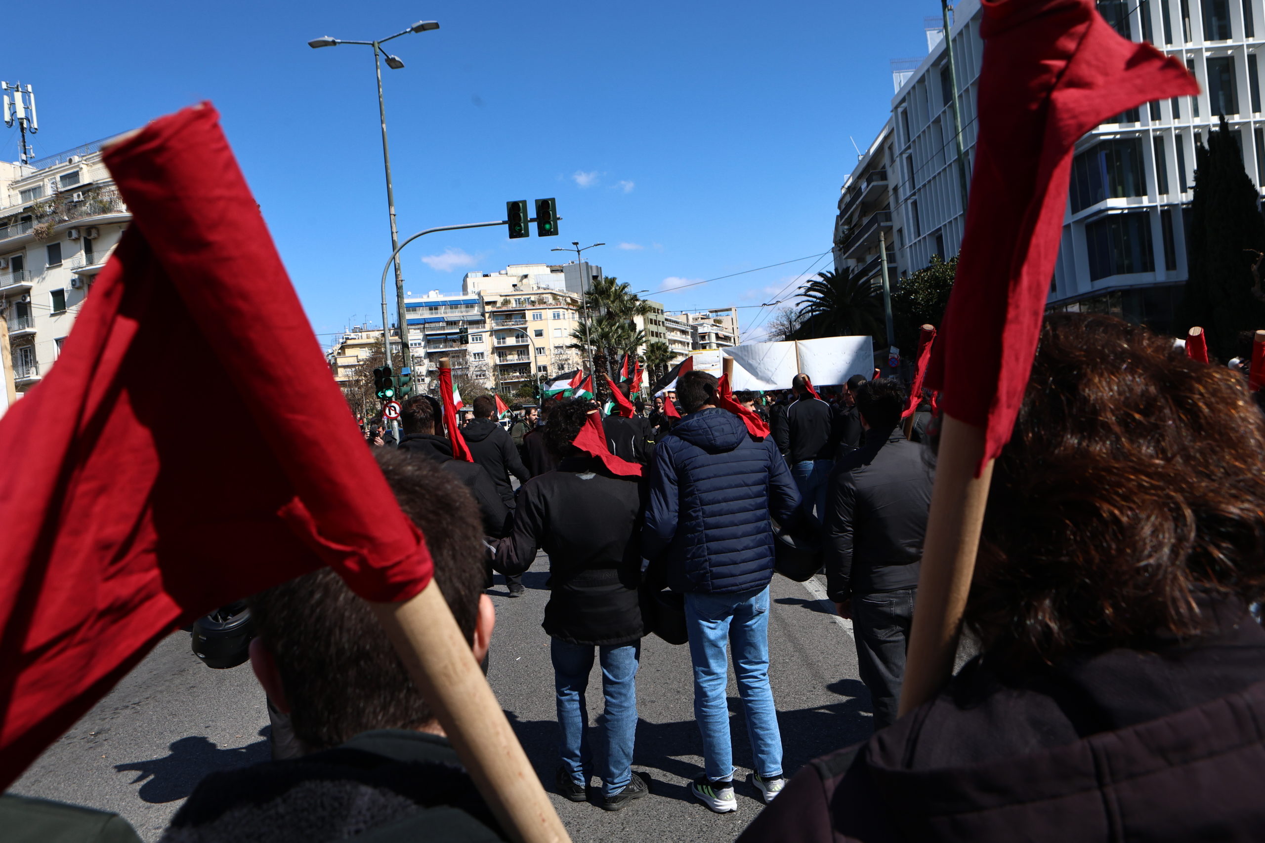 Σε πλήρη εξέλιξη βρίσκεται αυτή την ώρα μεγάλη κινητοποίηση σωματείων και συλλογικοτήτων, οι οποίες πραγματοποιούν πορεία από το Πάρκο Ελευθερίας προς την πρεσβεία των ΗΠΑ στην Αθήνα.