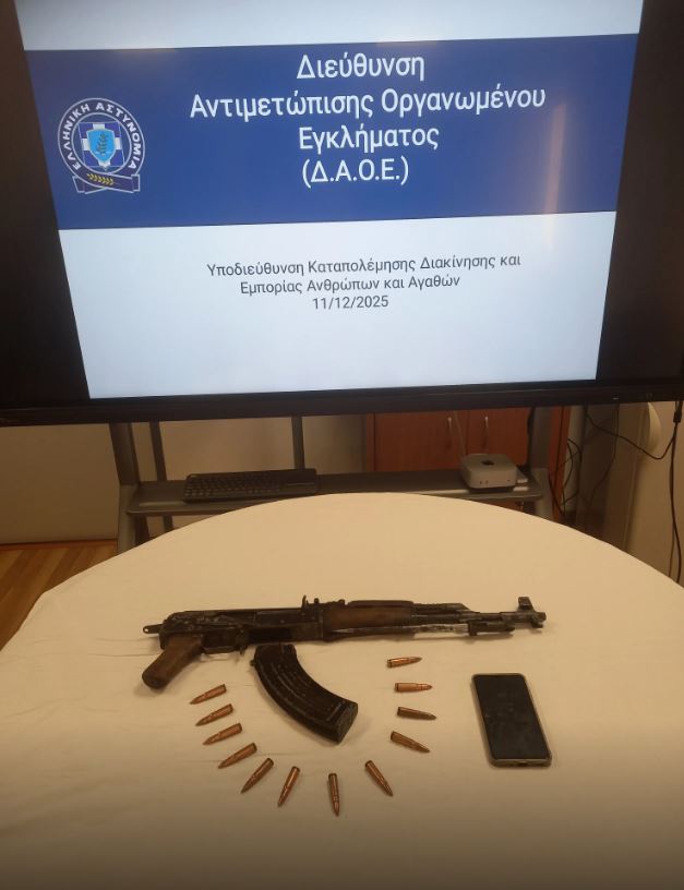 Από την Υποδιεύθυνση Καταπολέμησης Διακίνησης και Εμπορίας Ανθρώπων και Αγαθών της Διεύθυνσης Αντιμετώπισης Οργανωμένου Εγκλήματος συνελήφθη πρώτες πρωινές ώρες χθες, Πέμπτη 11 Δεκεμβρίου 2025, σε περιοχή της Αθήνας, 20χρονος ημεδαπός, ο οποίος κατείχε και μετέφερε πολεμικό τυφέκιο «Kalashnikov».