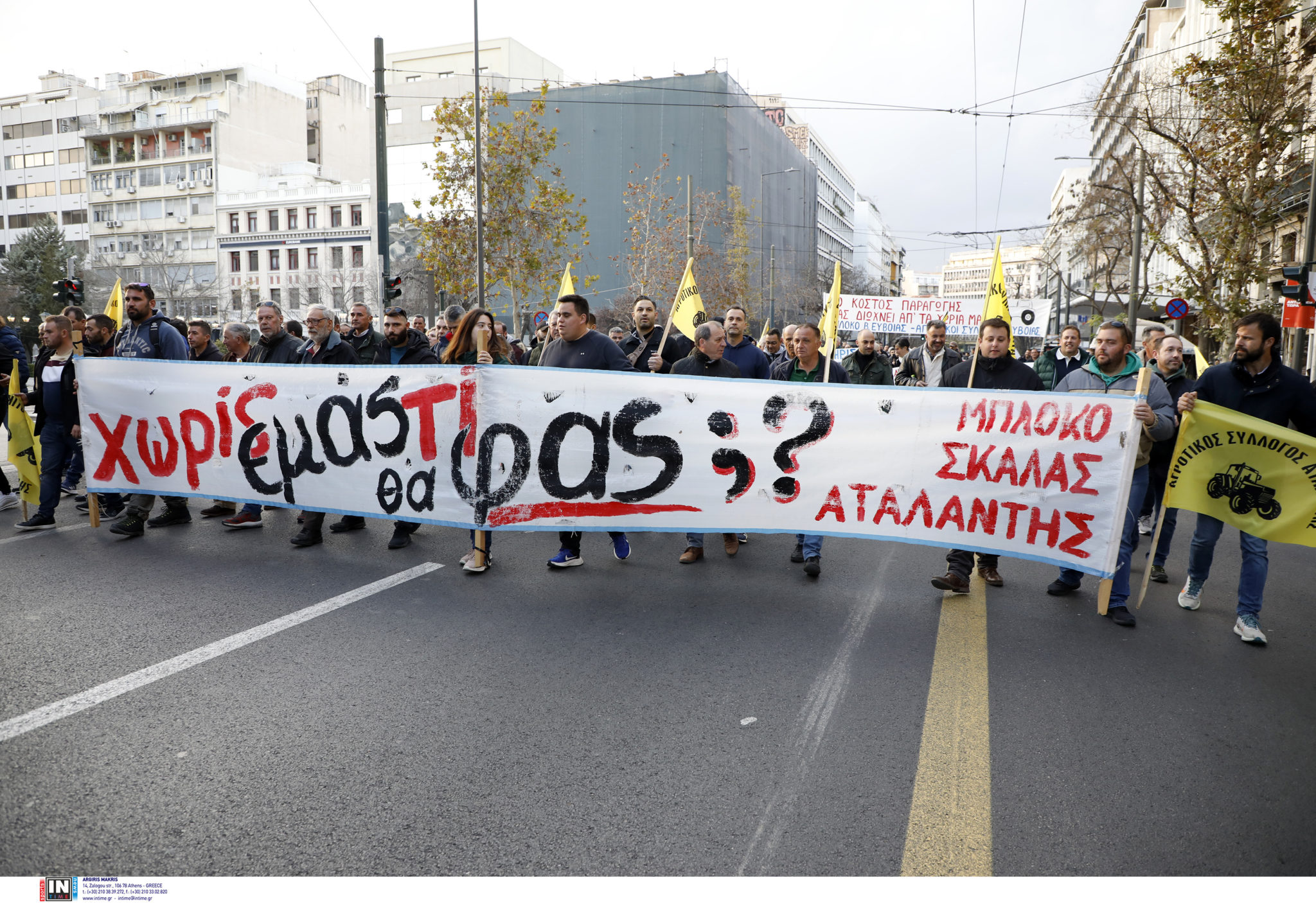 Αγρότες από τα μπλόκα της Καρδίτσας, της Αγιάς, της Φθιώτιδας, της Εύβοιας, της Αταλάντης και της Μεσσηνίας κατευθύνονται προς το Σύνταγμα μέσω της Πανεπιστημίου.