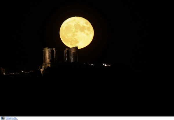 Η πανσέληνος δίνει απόψε ρεσιτάλ ομορφιάς στο ουράνιο θόλο της χώρας και οι εικόνες είναι άκρως εντυπωσιακές, αφού το υπέρλαμπρο Φεγγάρι του Οξύρρυγχου έχει «αγκαλιάσει» το ναό του Ποσειδώνα στο Σούνιο.
