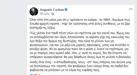 Η 17η Μαΐου ήταν η Παγκόσμια Ημέρα κατά της Ομοφοβίας, Αμφιφοβίας και Τρανσφοβίας και ο Αύγουστος Κορτώ θέλησε να στείλει ένα δυνατό μήνυμα κατά των διακρίσεων, γράφοντας για τη στιγμή που είπε στη μητέρα του ότι του αρέσουν τα αγόρια. “Όταν είπα στη μάνα μου ότι μ’ αρέσουνε τα αγόρια – το 1984 – θυμάμαι πως ένιωθα φριχτή ντροπή – παρ’ ότι λαλίστατος υπό άλλες συνθήκες, με το ζόρι ξεστόμιζα τις λέξεις” γράφει ο γνωστός συγγραφέας σε ανάρτησή του στο Facebook.