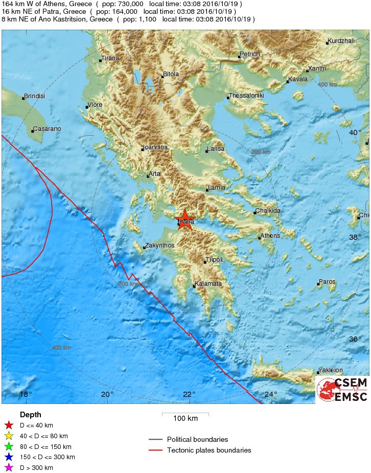 Πρόκειται για σεισμό μεγέθους 4 βαθμών της κλίμακας ρίχτερ με επίκεντρο 8 χιλιόμετρα βορειοανατολικά από το Καστρίτσι και 16 χιλιόμετρα βορειοανατολικά της Πάτρας, σύμφωνα με το ευρωμεσογειακό κέντρο.
