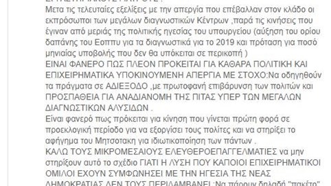 «Μετά τις τελευταίες εξελίξεις με την απεργία που επέβαλλαν στον κλάδο οι εκπρόσωποι των μεγάλων διαγνωστικών Κέντρων ,παρά τις κινήσεις που έγιναν από μεριάς της πολιτικής ηγεσίας του υπουργείου (αύξηση του ορίου δαπάνης του ΕΟΠΥΥ για τα διαγνωστικά για το 2019 και πρόταση για ποσό μηνιαίας υποβολής που δεν θα υπόκειται σε περικοπή).