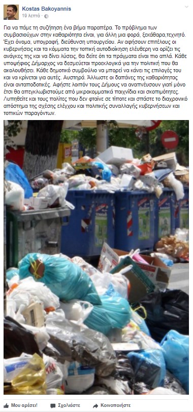 “Για να πάμε τη συζήτηση ένα βήμα παραπέρα. Το πρόβλημα των συμβασιούχων στην καθαριότητα είναι, για άλλη μια φορά, ξεκάθαρα, τεχνητό. Έχει όνομα, υπογραφή, διεύθυνση υπουργείου. Αν αφήσουν επιτέλους οι κυβερνήσεις και τα κόμματα την τοπική αυτοδιοίκηση ελεύθερη να ορίζει τις ανάγκες της και να δίνει λύσεις, θα δείτε ότι τα πράγματα είναι πιο απλά. Κάθε υποψήφιος Δήμαρχος να δεσμεύεται προεκλογικά για την πολιτική που θα ακολουθήσει. Κάθε δημοτικό συμβούλιο να μπορεί να κάνει τις επιλογές του και να κρίνεται για αυτές. Αυστηρά. Άλλωστε οι δαπάνες της καθαριότητας είναι ανταποδοτικές. Αφήστε λοιπόν τους Δήμους να αναπνεύσουν γιατί μόνο έτσι θα απεγκλωβιστούμε από μικροκομματικά παιχνίδια και σκοπιμότητες. Λυπηθείτε και τους πολίτες που δεν φταίνε σε τίποτε και σπάστε το διαχρονικό απόστημα της σχέσης ελέγχου και πολιτικής συναλλαγής κυβερνήσεων και τοπικών παραγόντων” έγραψε χαρακτηριστικά ο κ. Μπακογιάννης.