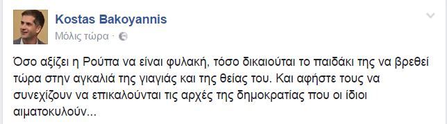 “Όσο αξίζει η Ρούπα να είναι φυλακή, τόσο δικαιούται το παιδάκι της να βρεθεί τώρα στην αγκαλιά της γιαγιάς και της θείας του. Και αφήστε τους να συνεχίζουν να επικαλούνται τις αρχές της δημοκρατίας που οι ίδιοι αιματοκυλούν…” έγραψε στο Facebook ο Περιφερειάρχης Στερεάς Ελλάδας.