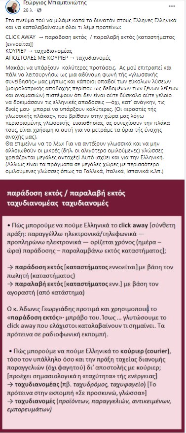 Στην ανάρτησή του ο κ. Μπαμπινιώτης αναφέρει: «Στο πνεύμα τού να μιλάμε κατά το δυνατόν στους Έλληνες Ελληνικά και να καταλαβαίνουμε όλοι τι λέμε προτείνω: CLICK AWAY → παράδοση εκτός / παραλαβή εκτός (καταστήματος [εννοείται]), ΚΟΥΡΙΕΡ → ταχυδιανομέας, ΑΠΟΣΤΟΛΕΣ ΜΕ ΚΟΥΡΙΕΡ → ταχυδιανομές».