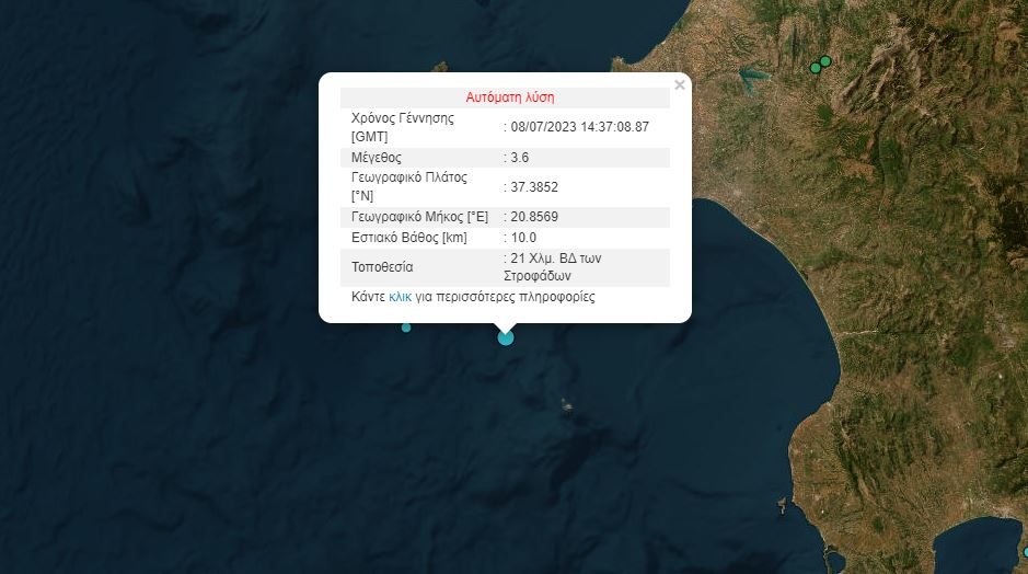 Σημειώνεται ότι περίπου την ίδια ώρα, σημειώθηκε και σεισμός στους Στροφάδες. Το επίκεντρο του σεισμού βρίσκεται σε θαλάσσια περιοχή 21 χιλιόμετρα βορειοδυτικά των Στροφάδων.  Το εστιακό βάθος υπολογίζεται σε 10 χιλιόμετρα.