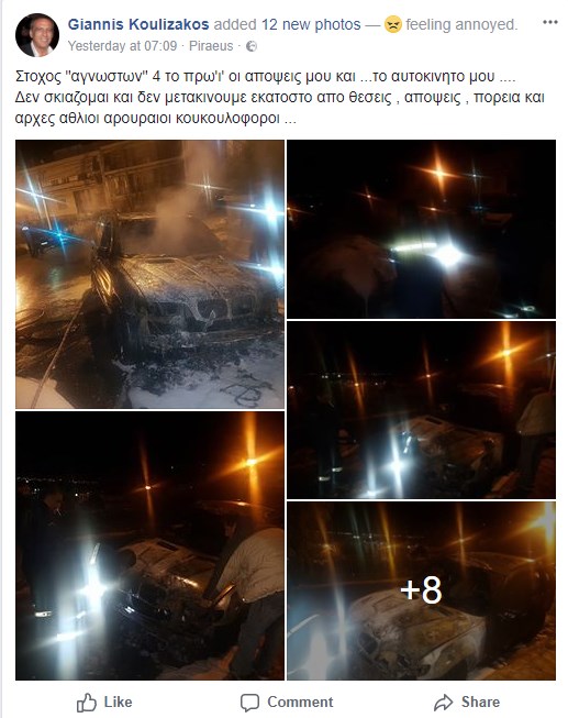 Όταν βγήκε ο κ. Κουλιζάκος στο δρόμο, οι εμπρηστές είχαν προλάβει να διαφύγουν. Ο ίδιος δημοσίευσε στον λογαριασμό του στο facebook βίντεο και φωτογραφίες.