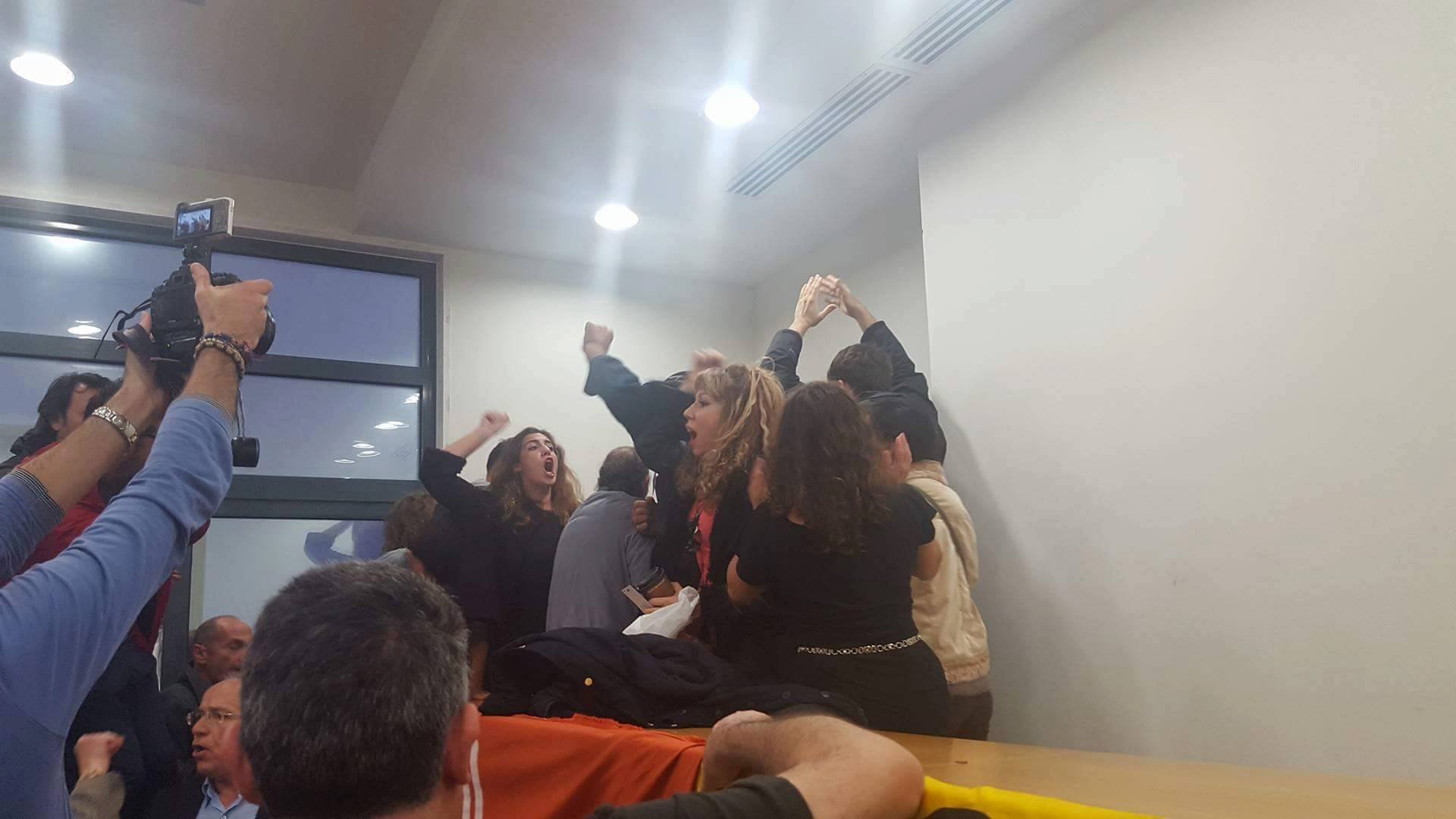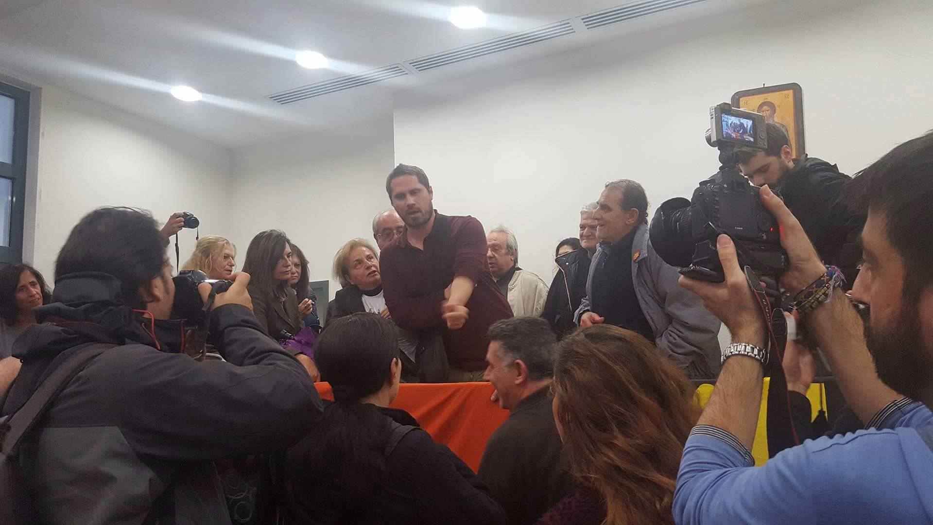 Εισέβαλαν στην αίθουσα του Ειρηνοδικείου με συνθήματα. Ύψωσαν πανό με συνέπεια η Ειρηνοδίκης να διακόψει τη διαδικασία και να φύγει από την αίθουσα.