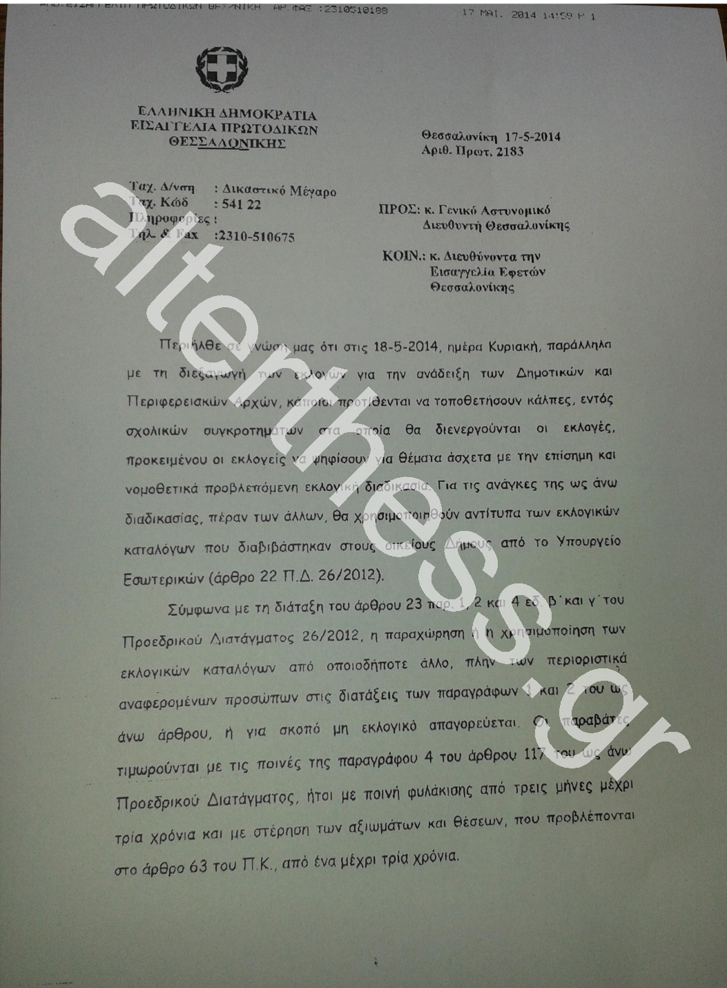 Συγκεκριμένα το έγγραφο της Εισαγγελίας Πρωτοδικών Θεσσαλονίκης προς το Γενικό Αστυνομικό Διευθυντή Θεσσαλονίκης και τον Διευθύνοντα την Εισαγγελία Εφετών Θεσσαλονίκης αναφέρει πως “η παραχώρηση ή η χρησιμοποίηση των εκλογικών καταλόγων από οποιοδήποτε άλλο… απαγορεύεται” και “οι παραβάτες τιμωρούνται… με ποινή φυλάκισης από τρεις μήνες μέχρι τρία χρόνια”.