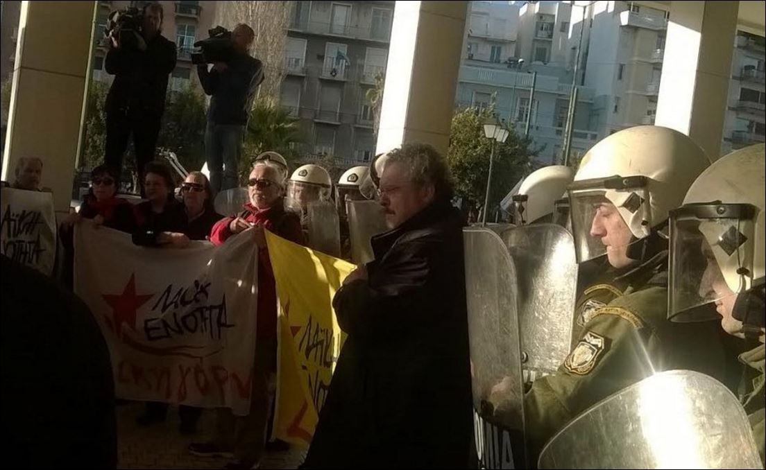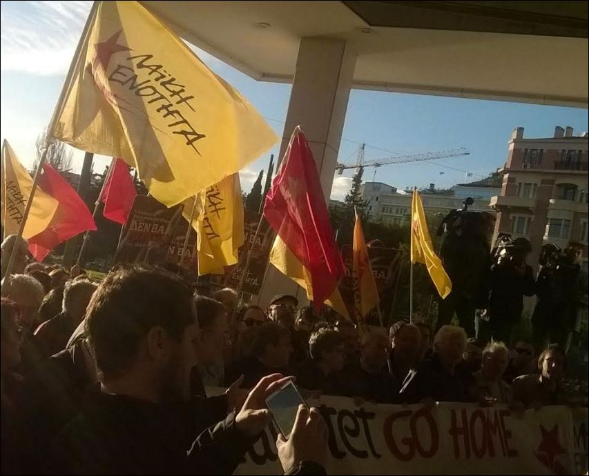 Τα μέλη της Λαϊκής Ενότητας, ανάμεσά τους και ο Παναγιώτης Λαφαζάνης και ο Δημήτρης Στρατούλης, συγκεντρώθηκαν στην κεντρική είσοδο του ξενοδοχείου, όπου πραγματοποιούνται οι διαπραγματεύσεις της κυβέρνησης με το κουαρτέτο.