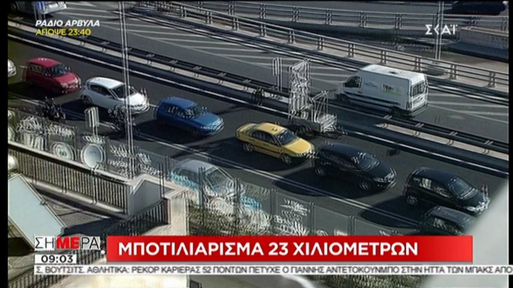 Όπως δείχνουν τα πλάνα από την κάμερα του ΣΚΑΙ, οι οδηγοί πρέπει να οπλιστούν με υπομονή καθώς το μποτιλιάρισμα φτάνει τα 23 χιλιόμετρα.