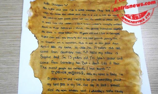 Ένα μπουκάλι με ένα γράμμα μέσα ήταν θαμμένο στην παραλία. Το μήνυμα είχαν γράψει τέσσερις έφηβες από τη Γερμανία, ενώ ήταν σε διακοπές στην Κροατία και είχε ημερομηνία «Παρασκευή 28 Αυγούστου 2015 – 10:52 το πρωί».